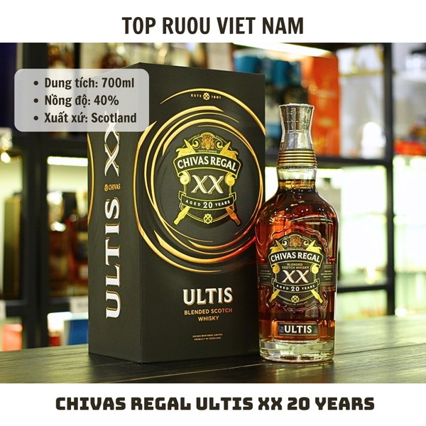 ✨ **Ultis XX 20 Năm** là phiên bản đặc biệt tôn vinh di sản Chivas với sự pha trộn từ 5 loại Single Malt hảo hạng – kết tinh bởi những bậc thầy pha chế hàng đầu. Đây là chai whisky thượng hạng dành cho người trân trọng chiều sâu, bản lĩnh & dấu ấn sang trọng.